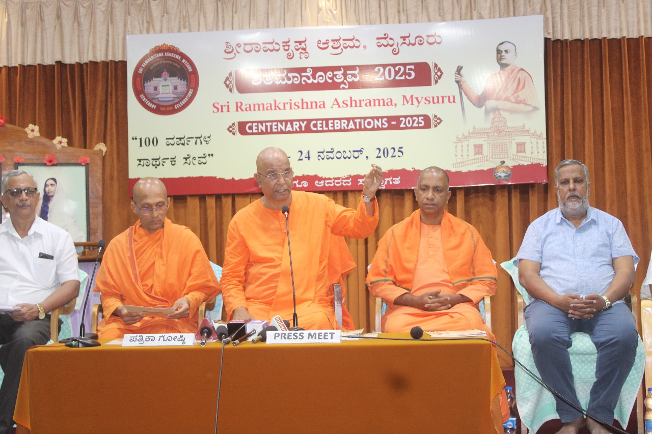 ಮೈಸೂರು ಯಾದವಗಿರಿಯ ಶ್ರೀ ರಾಮಕೃಷ್ಣ ಆಶ್ರಮವು ತನ್ನ ಸ್ಥಾಪನೆಯ ಶತಮಾನೋತ್ಸವದ ಸಂಭ್ರಮವನ್ನು ಈ ವರ್ಷ ನವೆಂಬರ್ ೨೧ ರಿಂದ ನಾಲ್ಕು ದಿನಗಳ ಕಾಲ ಅದ್ದೂರಿಯಾಗಿ ಹಾಗೂ ಹಲವು ಅರ್ಥಪೂರ್ಣ ಕಾರ್ಯಕ್ರಮಗಳೊಂದಿಗೆ ಆಚರಿಸಲಿದೆ. ೧೯೨೫ರಲ್ಲಿ ಸ್ಥಾಪಿತವಾದ ಮೈಸೂರಿನ ಈ ಆಶ್ರಮವು ಅಧ್ಯಾತ್ಮಿಕ, ಸಾಂಸ್ಕೃತಿಕ ಹಾಗೂ ಸಾಮಾಜಿಕ ಕ್ಷೇತ್ರಗಳಲ್ಲಿ ಶತಮಾನಸೇವೆ ಸಲ್ಲಿಸಿ, ಭಾರತೀಯ ಆಧ್ಯಾತ್ಮ ಪರಂಪರೆಗೆ ಮಹತ್ವದ ಕೊಡುಗೆ ನೀಡಿದೆ. ನೂರು ವರ್ಷಗಳ ಸಾರ್ಥಕ ಸೇವೆ ಸಲ್ಲಿಸಿದೆ ಯಾದವಗಿರಿಯಲ್ಲಿರುವ ಶ್ರೀರಾಮಕೃಷ್ಣ ಆಶ್ರಮದ ಸಭಾಂಗಣದಲ್ಲಿ ನಡೆದ ಸುದ್ದಿಗೋಷ್ಠಿಯಲ್ಲಿ ಅಧ್ಯಕ್ಷ ಸ್ವಾಮಿ ಮುಕ್ತಿದಾನಂದ ಮಾತನಾಡಿದರು. ಈ ಸಮಾರಂಭದಲ್ಲಿ ರಾಮಕೃಷ್ಣ ಮಠ ಮತ್ತು ಮಿಷನ್ನಿನ ಪರಮಾಧ್ಯಕ್ಷರಾದ ಪರಮ ಪೂಜ್ಯ ಸ್ವಾಮಿ ಗೌತಮಾನಂದಜಿ ಮಹಾರಾಜ್ ರವರು, ಸನಾತನ ಧರ್ಮದ ಸಂತ ಶ್ರೇಷ್ಠರು, ರಾಮಕೃಷ್ಣ ಮಠ ಮತ್ತು ಮಿಷನ್ನಿನ ೨೫೦ ಕ್ಕೂ ಮಂದಿ ಯತಿವರೇಣ್ಯರರು, ಕರ್ನಾಟಕ ಹಾಗೂ ಭಾರತ ಸರ್ಕಾರದ ಜನನಾಯಕರು ಮೊದಲಾದ ಗಣ್ಯಾತಿ ಗಣ್ಯರು ಹಾಗೂ ಸಹಸ್ರಾರು ಮಂದಿ ಭಕ್ತಾದಿಗಳು ಪಾಲ್ಗೊಳ್ಳುತ್ತಿದ್ದಾರೆ.ಚಿತ್ರದಲ್ಲಿ ಸ್ವಾಮಿ ಯುಕ್ತಶಾನಂದ, ಸ್ವಾಮಿ ಮಹಾಮೇದಾನಂದ, ಎಸ್. ಬಾಲಾಜಿ, ಟಿ.ಕೆ. ಚಂದ್ರಶೇಖರ್, ಪ್ರೊ. ಚಂದ್ರಶೇಖರ್, ಅರುಣ್ ಕುಮಾರ್ ಇದ್ದರು.